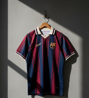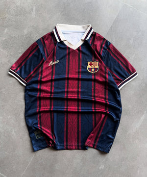 This isn't just a jersey; it is a work of art. The "L'Elegància" Polo reimagines the traditional Blaugrana stripes through a lens of baroque luxury. The fabric itself features an intricate damask/paisley pattern woven into the deep burgundy and navy stripes, giving it a rich, textural depth that catches the light. Topped with a vintage-inspired cream polo collar and finished with gold "Barça" script, this piece perfectly bridges the gap between 90s terrace culture and modern luxury fashion.