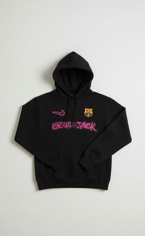 The ultimate football and fashion crossover. This exclusive black pullover hoodie features the FC Barcelona crest and the Nike swoosh, highlighted by the striking, neon pink "Cactus Jack" logo (Travis Scott's brand). A limited-edition piece that merges the iconic heritage of Barça with disruptive street style, perfect for fans who want to stand out both in the stadium and on the street.
