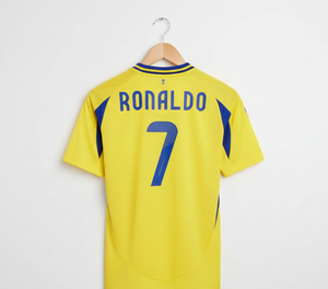 The official Cristiano Ronaldo Al Nassr 2024–25 home jersey features a bold and vibrant design, primarily in impact yellow with striking royal blue accents. Made by Adidas using 100% recycled polyester and AEROREADY moisture-wicking technology, the jersey is designed for comfort and breathability, offering a slim, athletic fit that stays true to size. It includes a clean V-neck collar, royal blue Adidas shoulder stripes, and proudly displays the woven Al Nassr club crest and blue Adidas logo on the chest.
